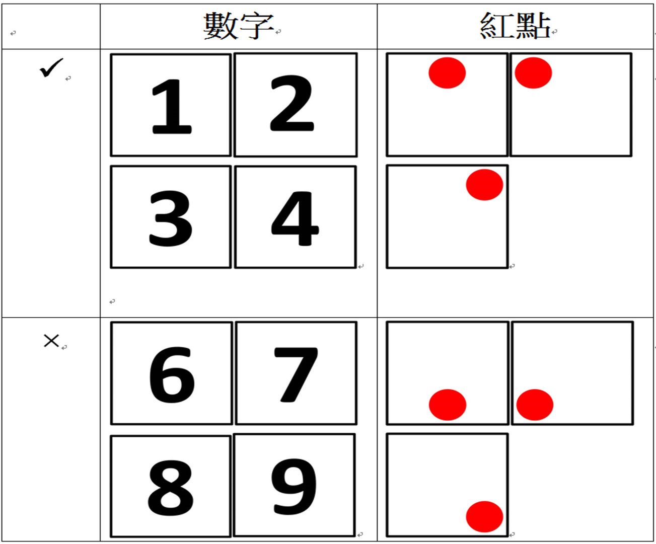(1) 數字題的指導語考慮改成「數字是不是大的?」,是大的數字請打勾,不是大的數字請打叉。此外把數字「4」跟「6」拿掉,應可減少數字題之難度。因「4」跟「6」離中間的數字 「5」比較近,判斷上較為困難。
